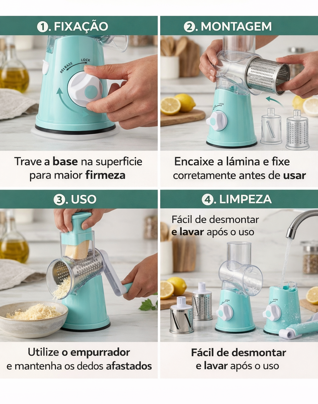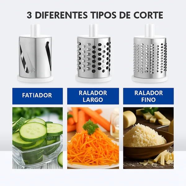 Você pode ralar, fatiar ou cortar alimentos como cenoura, pepino, queijo, batata e outros legumes com mais praticidade no dia a dia.